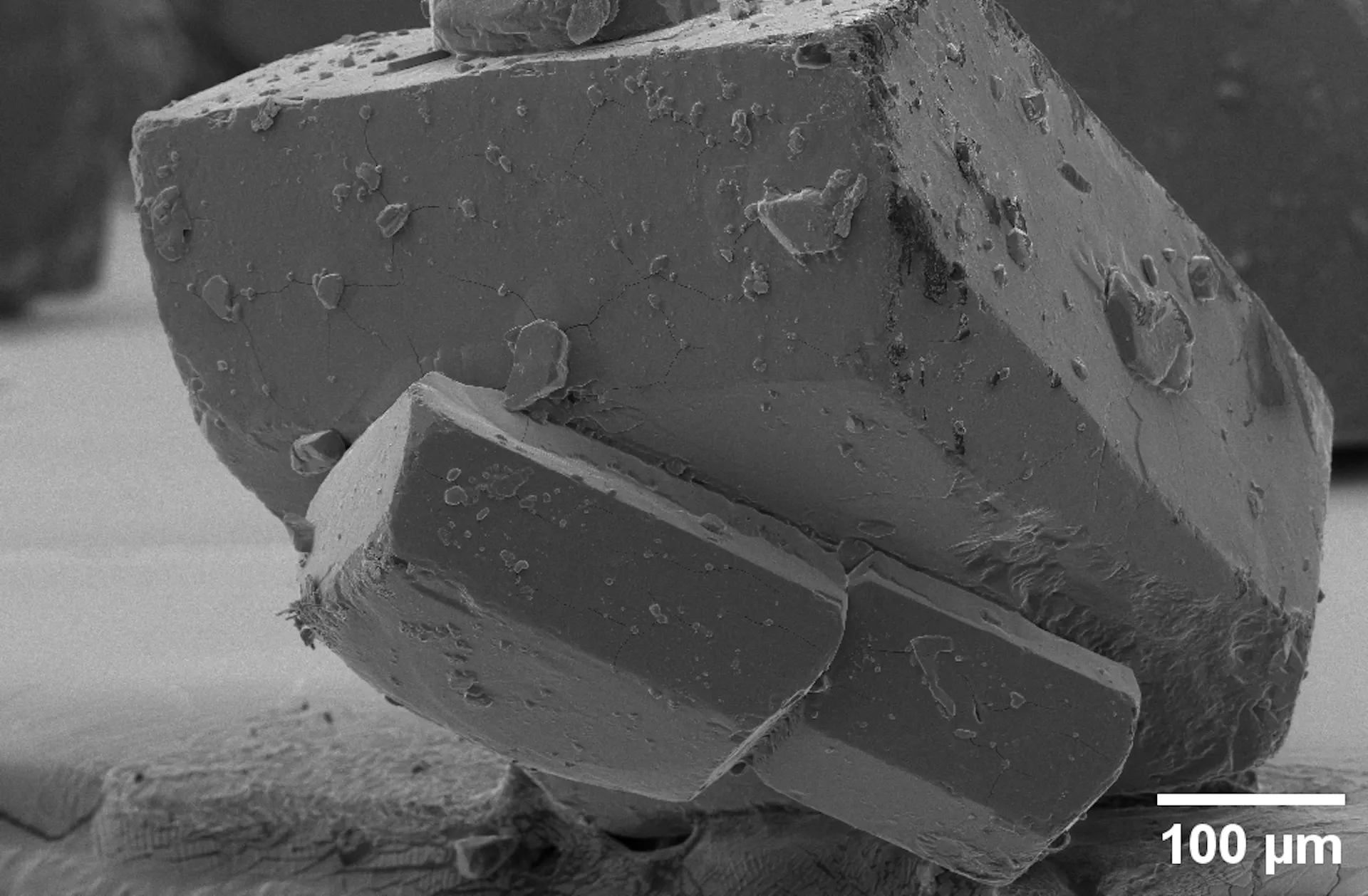 The SEM image shows brown sugar granules. The sample was coated with 10 nm Au/Pd using the RotaQ ES and imaged using a TESCAN VEGA3.