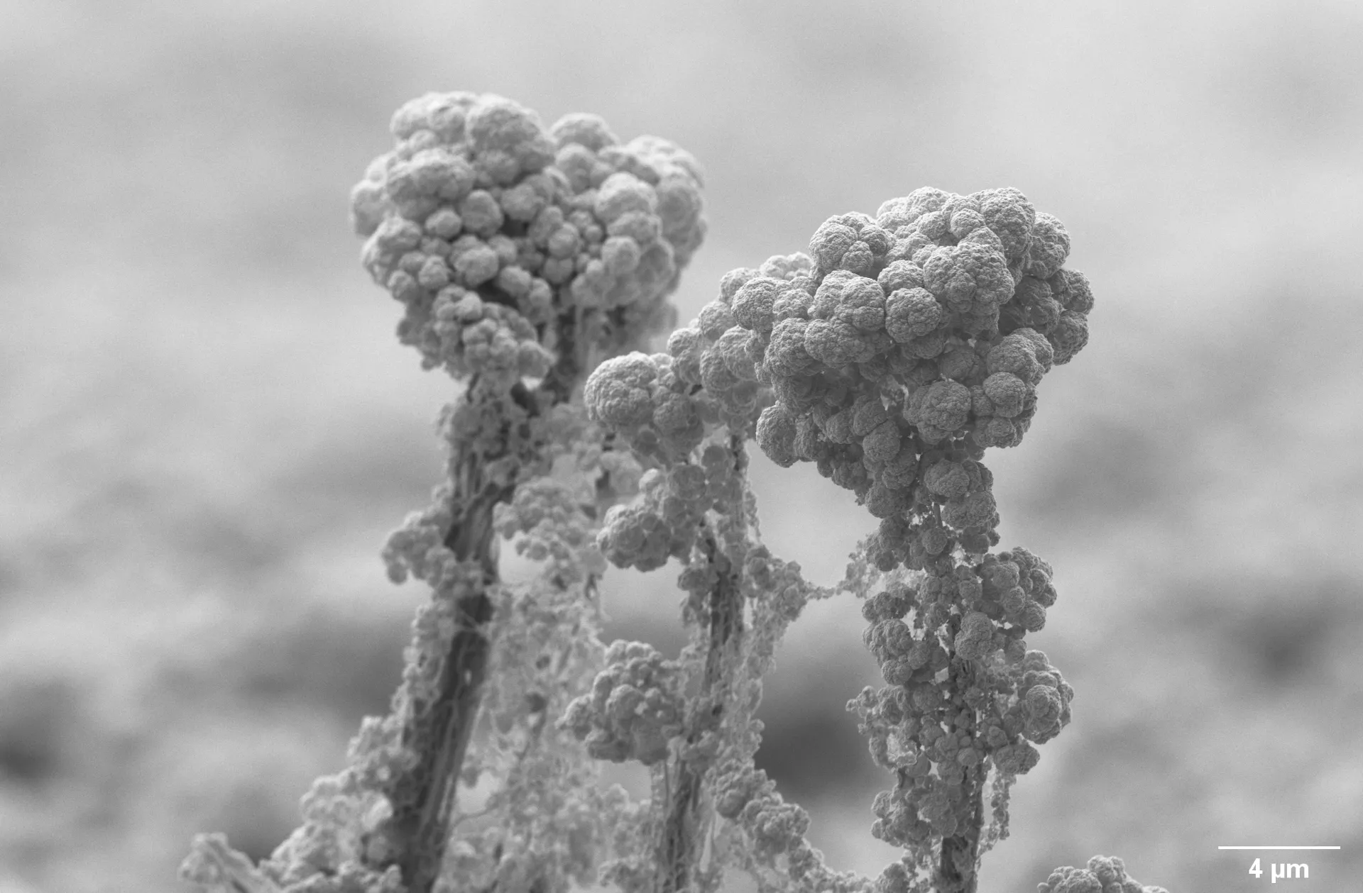 This SEM image captures mould growing on a carrot. A small section was cut, mounted onto a cryo stub, plunge-frozen in liquid nitrogen, fractured, and coated with platinum (10 mA, 60 s) using the PP3010. Imaging was performed on a Zeiss Crossbeam 550. Image courtesy of the Nanoscale and Microscale Research Centre (nmRC), by Nicola Weston and Dr. Chris Parmenter. Colourised by Steve Gschmeissner.