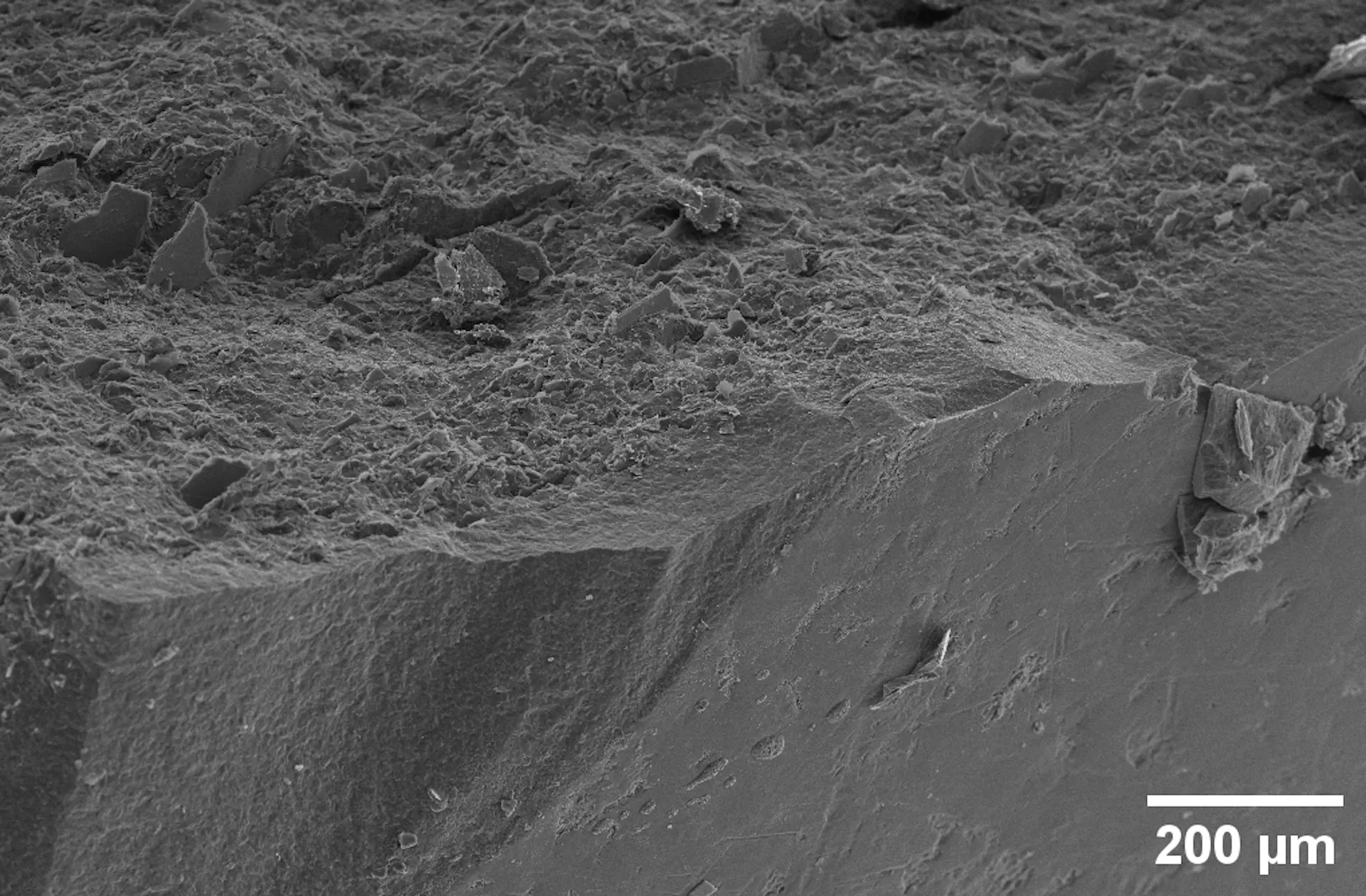 The SEM image shows a tablet coated in two polymer layers for controlled release of the pharmaceutical within the body.