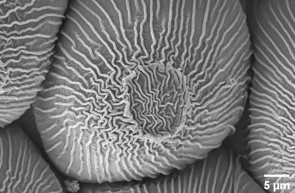 The SEM image shows the surface of a petal from a daffodil (Narcissus). The sample was prepared by fixation in 2.5 % glutaraldehyde (24 h), followed by washing with pH 7.4 phosphate buffer solution (3 x 1 h). The sample was transferred to ethanol through a series of dilutions (25 %, 50 %, 75 %, 95 %, 100 %), and dried using the K850 critical point dryer. The sample was coated in 10 nm Cr using the TurboQ ES and imaged in a Zeiss LEO Gemini 1525 FEG-SEM.