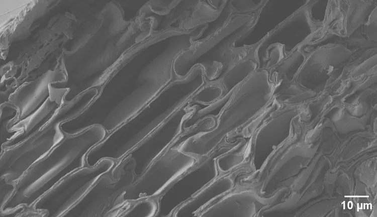 The SEM image shows the stem of a Gingko leaf. The sample was collected from the Botanical Gardens in Cambridge. A small section of the stem was cut from the leaf and mounted using a mixture of Tissue Tek and colloidal graphite (70:30 ratio) onto a cryo stub. The sample was then plunged freezed in LN2, coated with 5 nm of Au/Pd using the Quorum PP3010 cryo system. This sample was then loaded onto a Quorum cold stage and imaged within a Zeiss Evo. A beam energy of 6.00kV was used with a probe current of 16 pA.