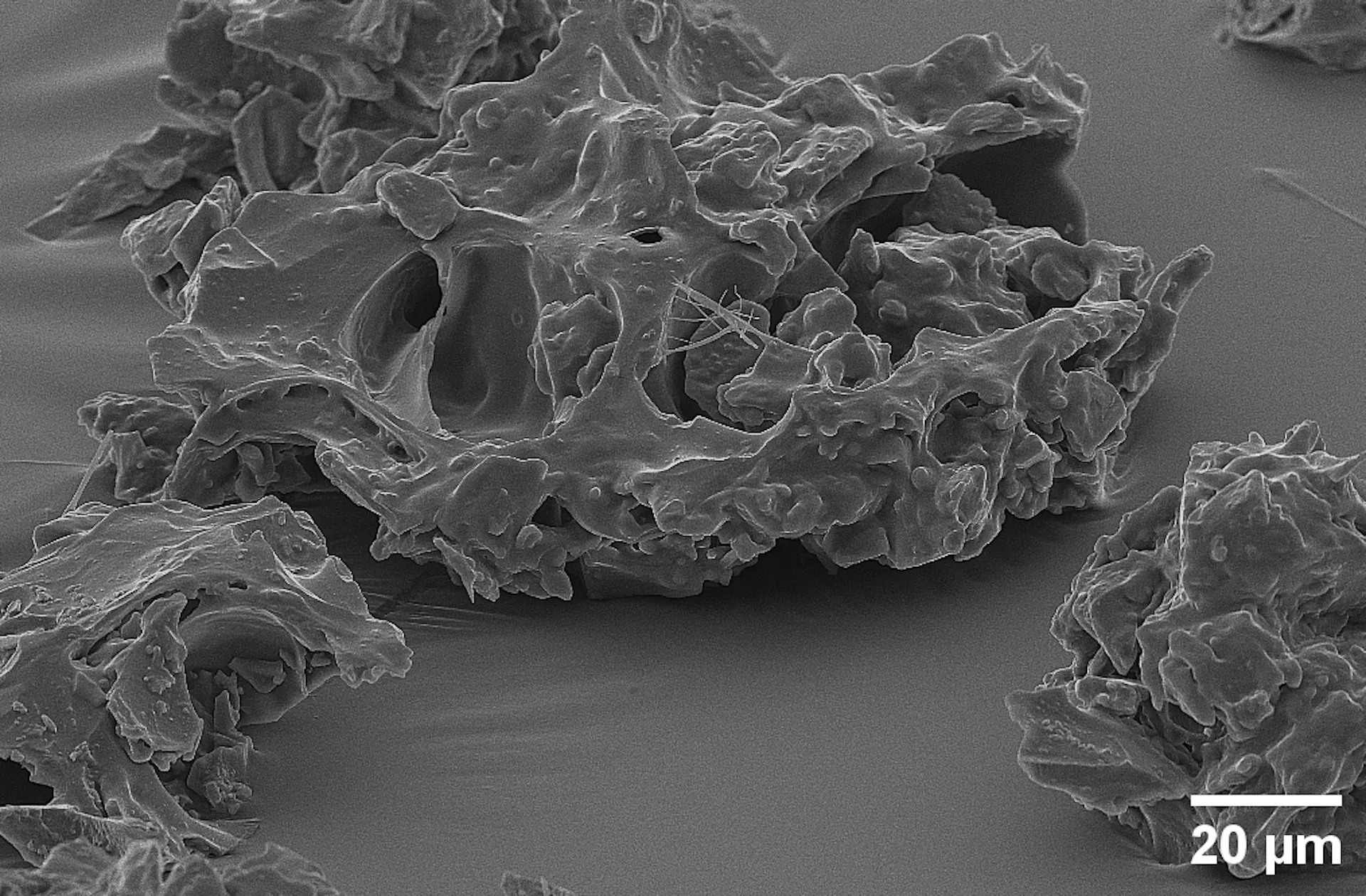 The SEM image shows ground coffee granules. The sample was coated with 10 nm Au/Pd using the RotaQ ES and imaged using a TESCAN VEGA3.