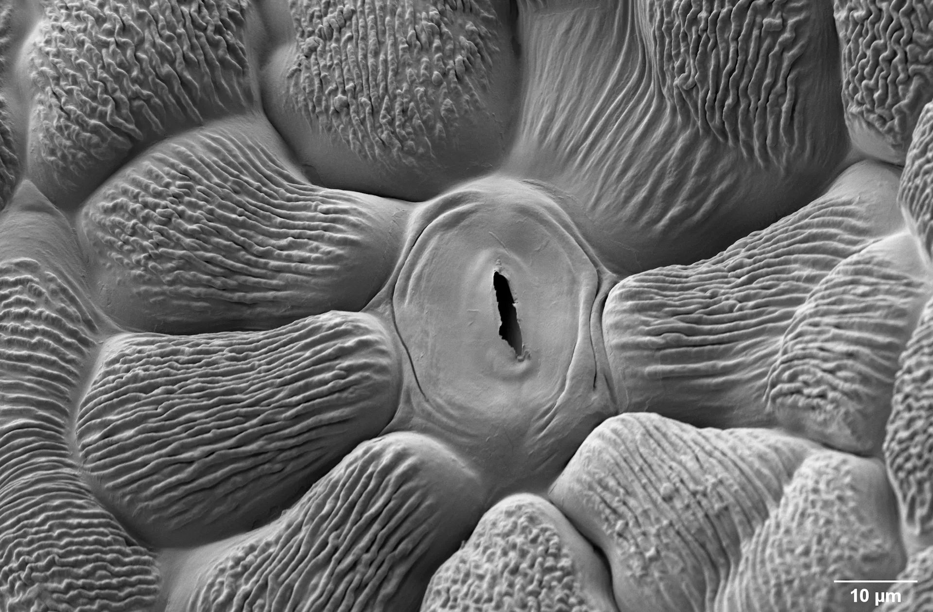 This SEM image highlights the stomata on the surface of a leaf. A small section was cut and mounted on a cryo stub, plunge-frozen in liquid nitrogen, fractured, and coated with platinum (10 mA, 60 s) using the PP3010. Imaged on a Zeiss Crossbeam 550. Image courtesy of the Nanoscale and Microscale Research Centre (nmRC), by Nicola Weston and Dr. Chris Parmenter. Colourised by Steve Gschmeissner.