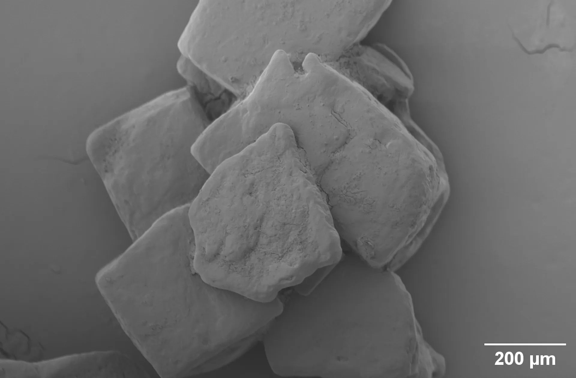 The SEM image shows brown sugar granules. The sample was coated with 10 nm Au/Pd using the RotaQ ES and imaged using a TESCAN VEGA3.